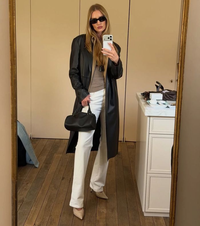 Розі Гантінгтон-Вайтлі підтримала тренд, зупинившись на моделі з фінішем під черепаховий панцир. Вона поєднала туфлі зі шкіряним тренчем, джемпером відтінку моко та білими джинсами. Аксесуари — чорна сумка та сонцезахисні окуляри — зробили образ простим, але бездоганно вишуканим.