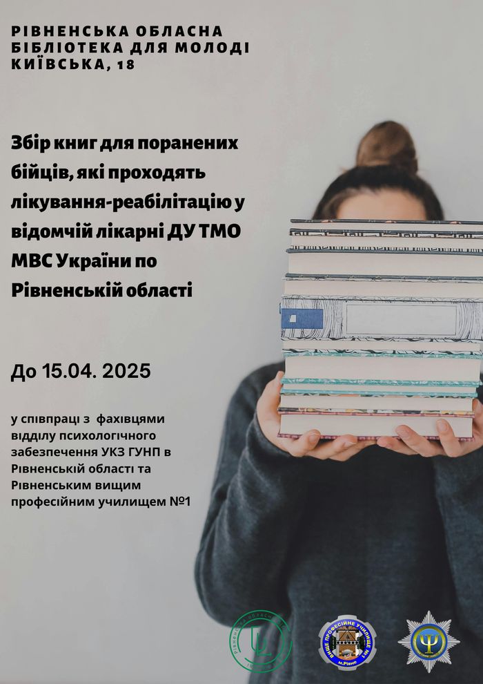 Рівненська обласна бібліотека для молоді разом з фахівцями відділу психологічного забезпечення УКЗ ГУНП в Рівненській області (Служба психологічного забезпечення ГУНП в Рівненській області) та Рівненським вищим професійним училищем №1 (ВПУ 1 м. Рівне) оголошують про початок збору книг для наших героїв! Всі зібрані книги будуть передані пораненим бійцям, які проходять лікування та реабілітацію у відомчій лікарні ДУ ТМО МВС України по Рівненській області.